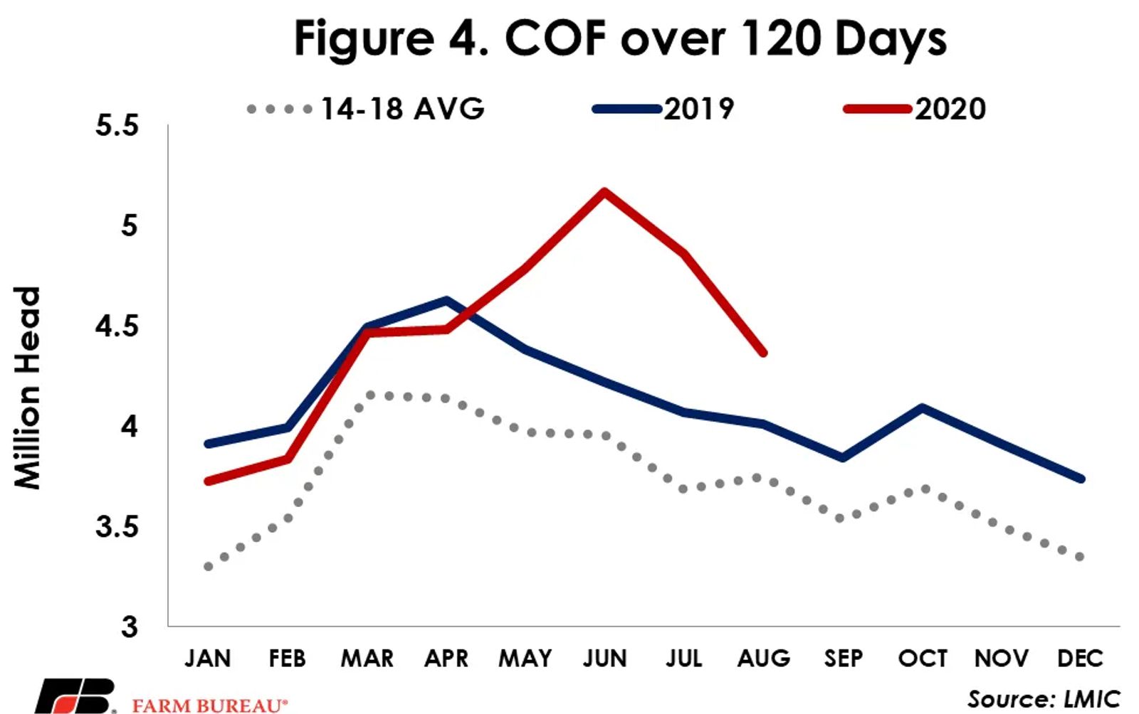 Placements were up across almost all weight categories. There was a slight decline in placements in the two categories above 900 lbs, which tells us we continue to work through the backlog of heavier animals resulting from the COVID-19-induced labor issues at processing facilities in early summer. July marked a month of progress for moving some of these heavier cattle off of pasture and onto feed, particularly in the Southern Plains. However, as Figure 4 shows us, we are still seeing very high numbers of estimated animals on feed over 120 days.