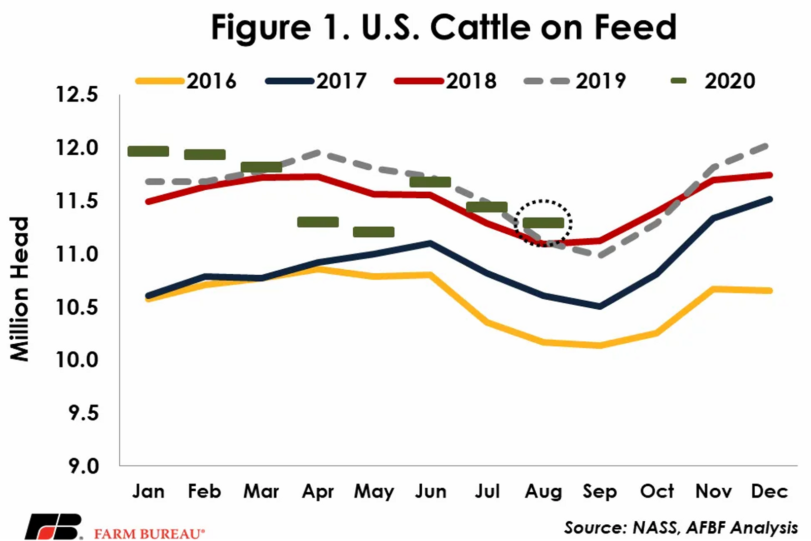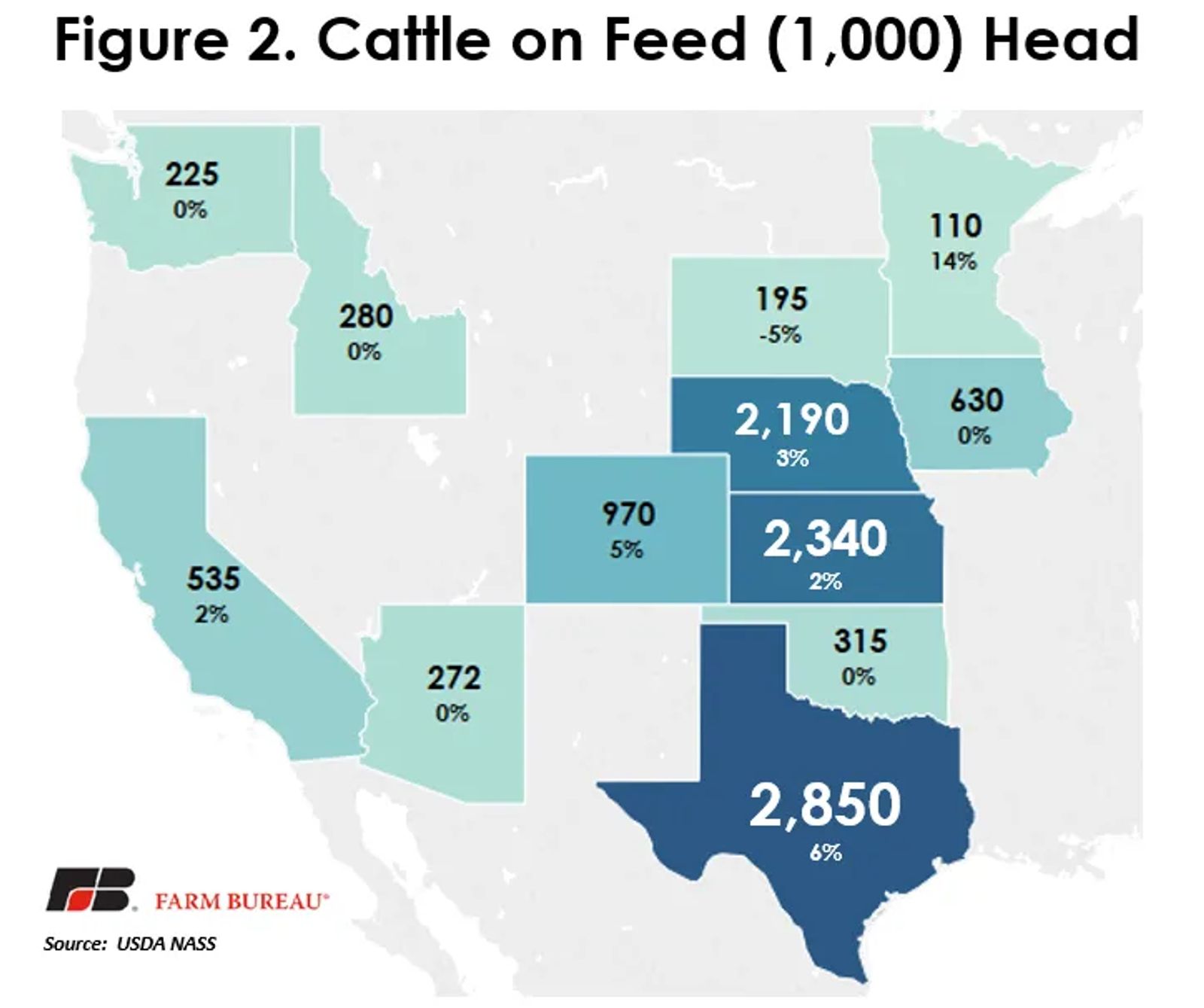 As usual, Texas, Kansas and Nebraska lead the way in total fed cattle numbers, accounting for nearly 7.6 million head, or approximately 64% of the total on-feed inventory in the country. Texas continued to gain year-over-year, adding 6% relative to 2019. Kansas also had a gain, adding 2% over 2019, and Nebraska reported a 3% increase.