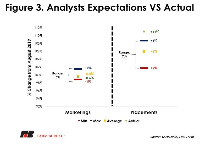 While total inventories are an important component of the report, other key factors include placements (new animals being placed on feed) and marketings (animals being taken off feed and sold for slaughter). Coming in at 11% over 2019, placements in July far exceeded both the average analyst expectation of a 6% increase as well as the maximum analyst expectation of an 8.7% increase. The relatively wide range of forecasts for placements -- 7% -- somewhat highlights the uncertainty that still exists in the market around the full impacts of COVID-19. Placements clocked in at 1.893 million head in July. Marketings largely fell within the predicted range at 1.990 million head, a small increase over year-ago levels.