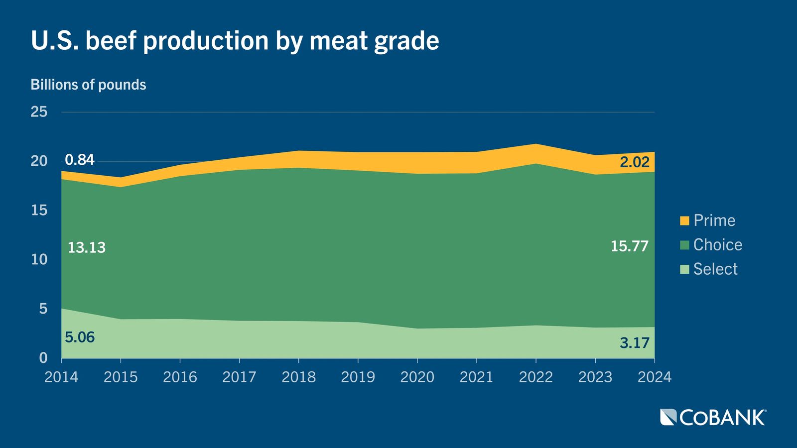 Consumer beef demand has been exceptional in recent years, and a major reason is quality. Cattle producers have collectively excelled in delivering high quality beef while maintaining production efficiency. A “prime” example is the top grade of beef, USDA Prime. One decade ago, only 4.4% of U.S. beef production graded Prime. In 2024, Prime grade beef was 9.6% of total production at 2.02 billion pounds. Choice beef grew 20% and makes up over three-quarters of market share with 15.77 billion pounds produced in 2024. Production of lower grade meat like Select was cut by 37% from 2014 to 2024 to end at 3.17 billion pounds.