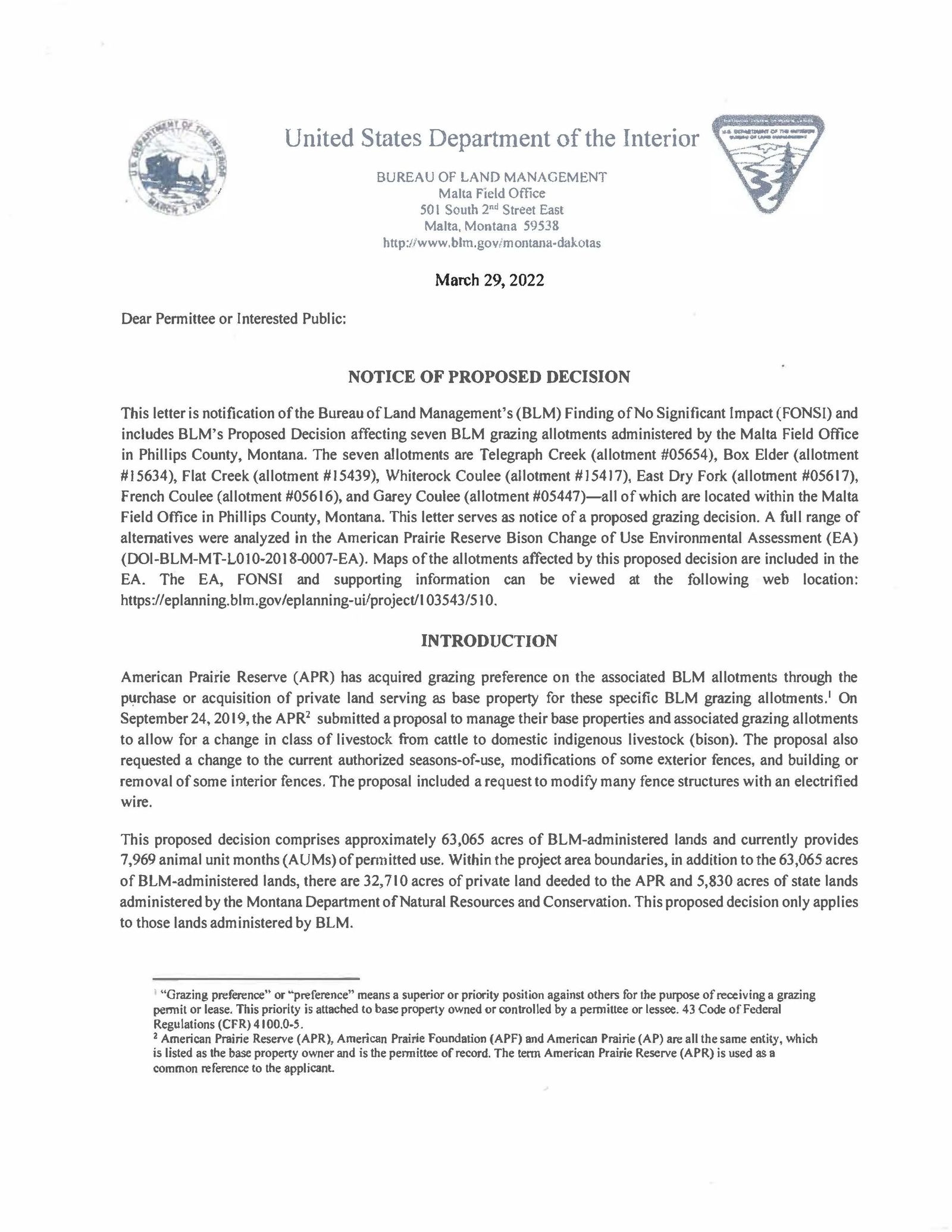 The Bureau of Land Management has announced a notice of proposed decision of a Finding of No Significant Impact in the request by the American Prairie Reserve affecting 7 BLM allotments in Phillips County. In short, it means that the American Prairie Reserve seems to be getting everything they wanted when it comes to changing those public land allotments in changing the status of livestock from grazing from cattle to "domestic indigenous livestock (bison)" and removing and changing interior fencing.