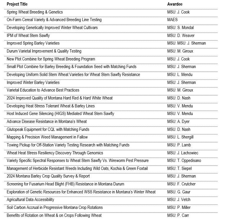 The 2024 increase in available funds reflected two changing conditions in Montana’s grain business. In 2023, most areas of the state had ample moisture. “That meant more bushels in the bin generating increased checkoff dollars,” said Angvick. “We also had an increase in the assessment per bushel for wheat and barley, and that has also helped to increase dollars toward research funding.” Angvick noted that each year’s research funding helps support personnel such as graduate students, project work at Montana Agricultural Experiment Stations (MAES) and much more.