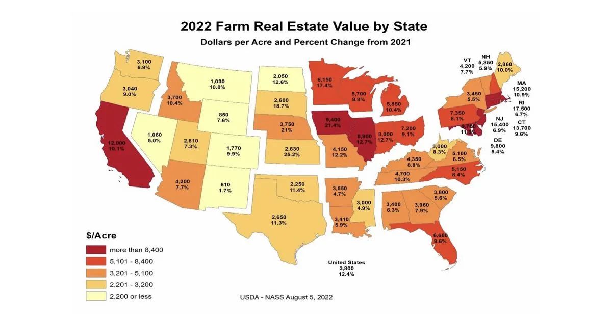 August 12, 2022 - The USDA’s annual Land Values Report shows that farmland values pushed higher this year. Tony Dorn is Chief of the Environmental, Economics, and Demographics Branch of the National Agricultural Statistics Service. He says that farmland values jumped more than 12% from last year. This is the highest increase overall for the value of farm real estate since 2006 when land values increased 14% from 2005.