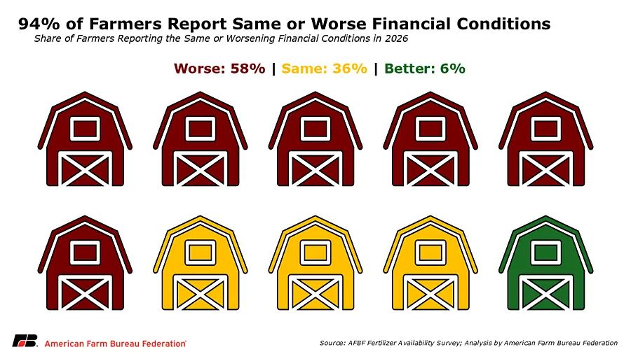 Higher energy prices also increase the cost of producing nitrogen fertilizer, which relies heavily on natural gas as feedstock. Together, these overlapping increases in fuel and fertilizer expenses help explain why more than 90% of farmers surveyed reported that their financial conditions have worsened or remained the same since last year.