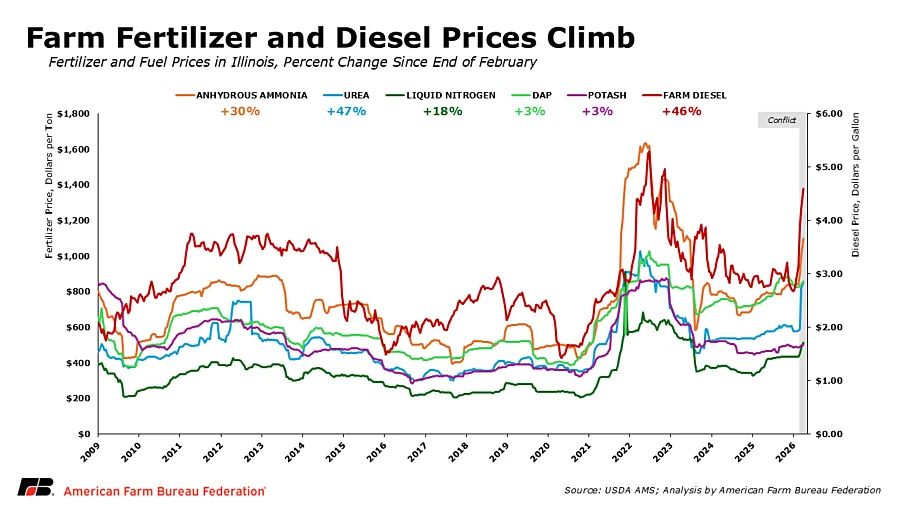 Spring planting decisions depend heavily on access to fertilizer and diesel fuel, both of which have been impacted by geopolitical risks that have disrupted global markets. Since the escalation of tensions in the Middle East, nitrogen fertilizer prices have risen more than 30%, while combined fuel and fertilizer costs have increased roughly 20% to 40%. Urea prices have increased by 47% since the end of February, marking the largest month-to-month percentage increase in the price of urea. These increases are occurring when many producers were already facing tight margins for many consecutive years.