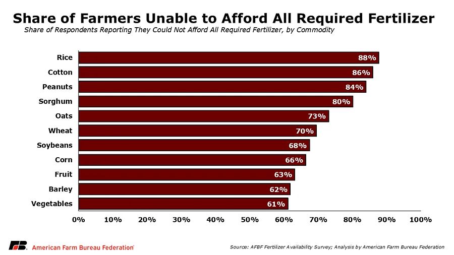 Affordability concerns are even more pronounced when viewed by commodity. More than 80% of rice, cotton and peanut producers reported they cannot afford all required fertilizer, highlighting the vulnerability of these production systems to input cost shocks. Over half of all commodities report not being able to afford all fertilizer needs this year.