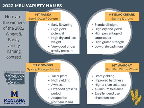 After inviting the public to help name three new publicly released wheat varieties and one new barley variety, the Montana Wheat & Barley Committee (MWBC) and Montana State University Plant Sciences and Plant Pathology Department (MSU) are announcing the highly awaited results.