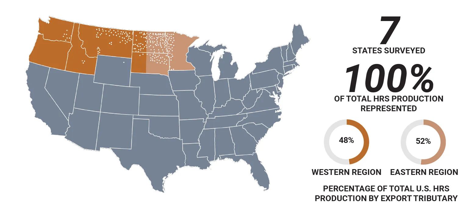 The average GRADE for the 2022 HRS harvest survey is U.S. No. 1 Northern Spring (NS); 97% of Eastern Region samples and 85% of Western Region samples grade U.S. No. 1.