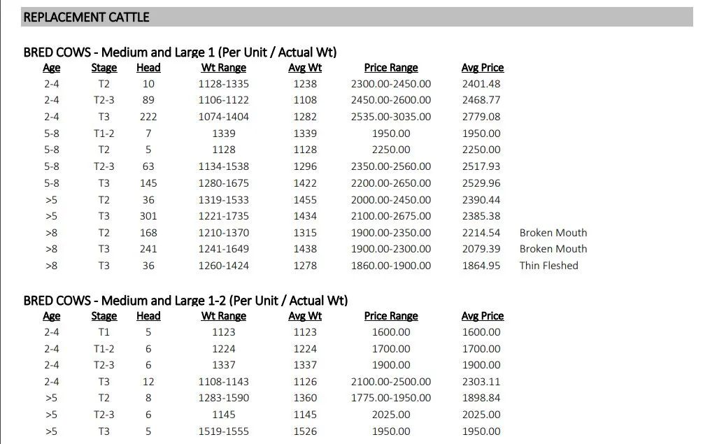 The sale featured over 2,500 head of bred cows and heifers, with quality ranging from average to very attractive. Prices for cows saw a significant increase compared to the previous Blue Ribbon sale in December, with most offerings selling $400-700 per head higher. Similarly, demand for heifers was strong, with most bred heifers selling for $300.00-400.00 per head higher than in December. Market activity remained active throughout the sale, reflecting the ongoing demand for replacement cattle. The supply consisted entirely of replacement cattle, with 67% being bred cows and 33% bred heifers. The sale's timing corresponded to the third trimester, extending from the current period until mid-May, with the subsequent trimesters defined accordingly.