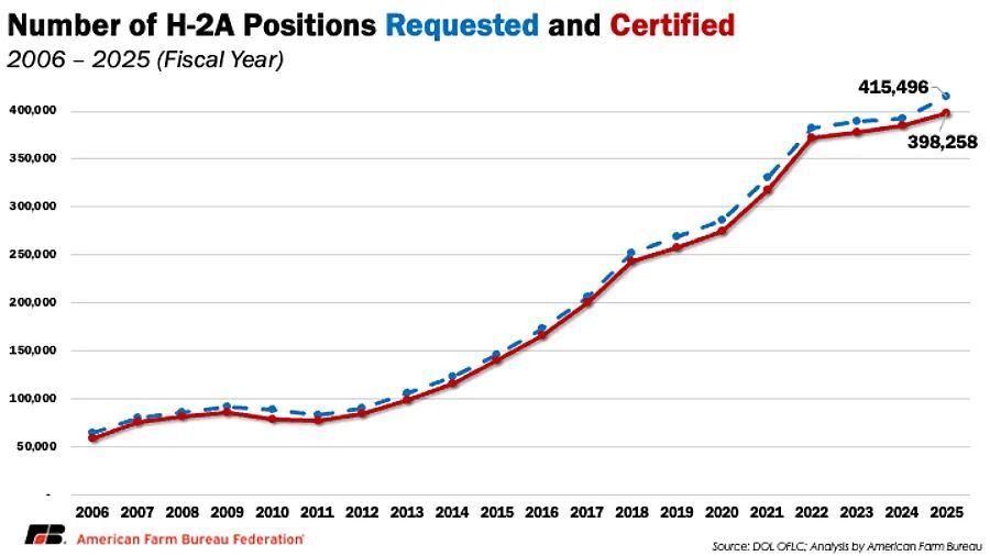 - The H-2A program continues to grow with 398,258 positions certified in fiscal year 2025.