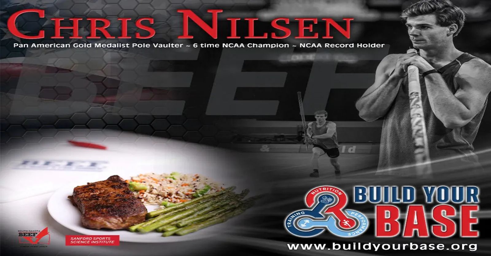 U.S Pole Vault Champion, Chris Nilsen established a deeper connection with the South Dakota Beef Industry Council (SDBIC) and the Sanford Sports Science Institute through a recent endorsement of the Build Your Base with Beef Program (Build Your Base). Build Your Base is a comprehensive sports nutrition program developed through a collaborative partnership between the SDBIC, Sanford Health, and the Sanford Sports Science Institute (SSSI) and utilizes beef as the premier protein.