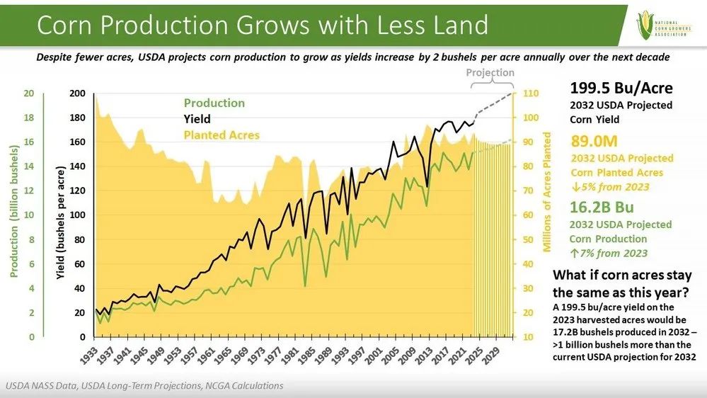 The continued growth potential for corn productivity in the future makes corn an ideal and environmentally friendly feedstock for biofuels and sustainable aviation fuel without using more land or taking supply away from feed needs for livestock and other valued users of corn.