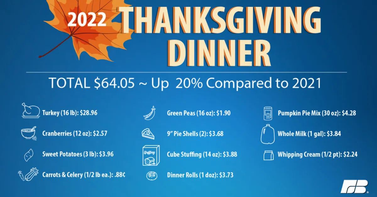 November 16, 2022 - Spending time with family and friends at Thanksgiving remains important for many Americans and this year the cost of the meal is also top of mind. Farm Bureau’s 37th annual survey provides a snapshot of the average cost of this year’s classic Thanksgiving feast for 10, which is $64.05 or less than $6.50 per person. This is a $10.74 or 20% increase from last year’s average of $53.31.