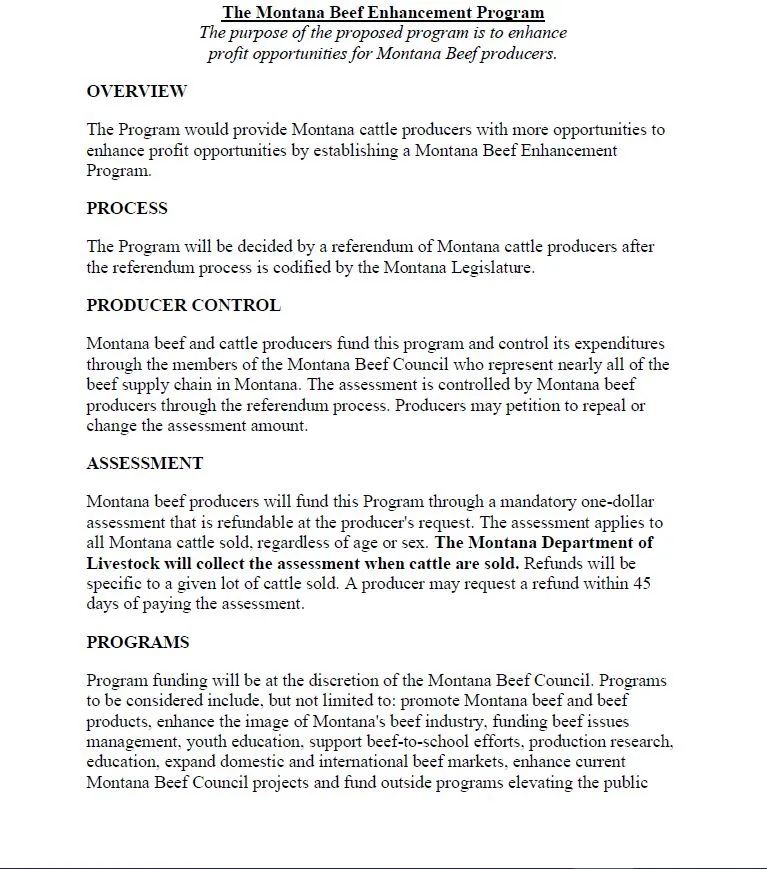 Delegates at the Montana Farm Bureau recently passed policy to support The Montana Beef Enhancement Program. The purpose of the proposed program is to enhance profit opportunities for Montana Beef producers. The program would include a $1 assessment fee collected each time cattle are sold. (Full Text of the program can be found below)