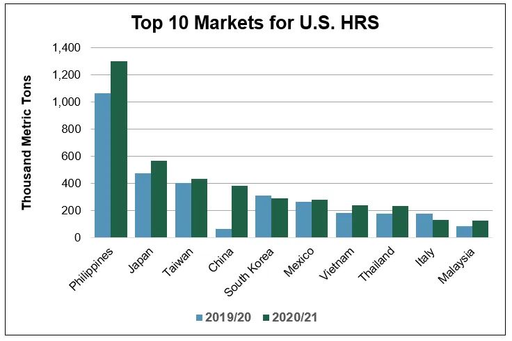 HRS. Total HRS export sales of 4.72 MMT are 15 percent ahead of this time last year and are 8 percent ahead of the 5-year average. Sales to the Philippines, the top market for HRS, are 22 percent ahead of last year at 1.30 MMT and are 34 percent ahead of the 5-year average. Rising per capita consumption combined with population growth and competitive HRS prices early in the marketing year supported strong sales to the Philippines at the start of 2020/21.