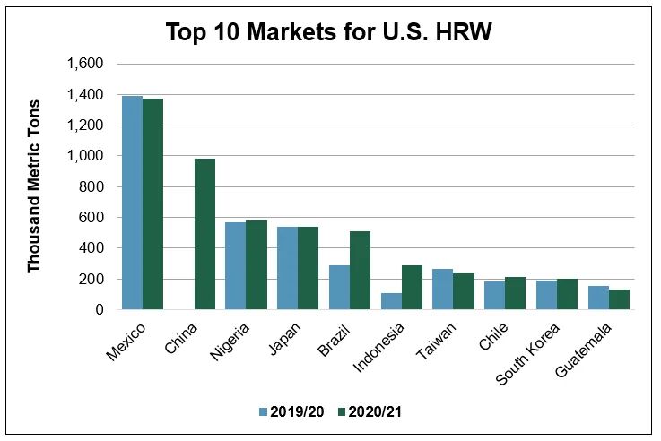 As of Oct. 29, China has purchased 981,000 metric tons (MT) of HRW after no purchases in 2019/20. Strong HRW export sales so far in 2020/21 can be attributed to the Phase One agreement between the United States and China, as well as competitive HRW prices early in the marketing year. So far in MY 2020/21, China is the second largest market for HRW behind Mexico.