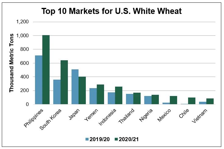 White. Total U.S. white wheat sales are 41 percent ahead of this time in 2019/20 at 4.02 MMT and are 36 percent ahead of the 5-year average. In the Philippines, the largest market for U.S. soft white wheat, export sales are up 42 percent on the year and are 40 percent ahead of the 5-year average.
