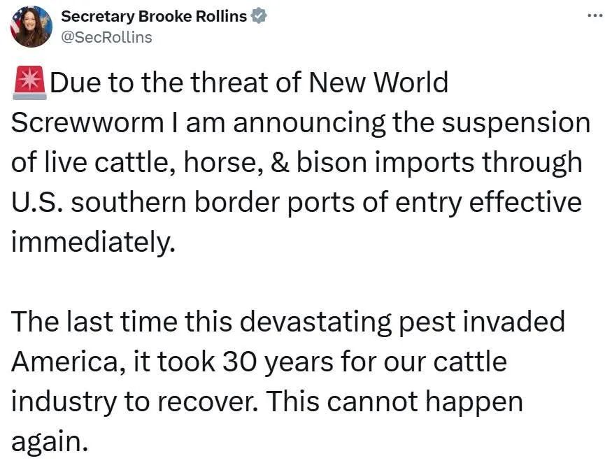 “The United States has ordered the suspension of livestock imports through ports of entry along our southern border after the continued spread of the New World Screwworm in Mexico. Secretary Berdegué and I have worked closely on the NWS response; however, it is my duty to take all steps within my control to protect the livestock industry in the United States from this devastating pest,” said Secretary Rollins. “The protection of our animals and safety of our nation’s food supply is a national security issue of the utmost importance. Once we see increased surveillance and eradication efforts, and the positive results of those actions, we remain committed to opening the border for livestock trade. This is not about politics or punishment of Mexico, rather it is about food and animal safety.”