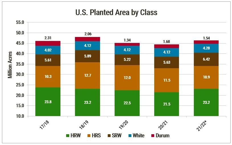 For all U.S. wheat, USDA now expects planted area for harvest in 2021 to total 46.4 million acres (18.8 million hectares), up 4% on the year due to significant increases in both hard red winter (HRW) and soft red winter (SRW) planted area.